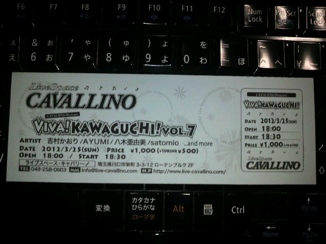 川口 Live Space CAVALLINO presents VIVA KAWAGUCHIVol.7 埼玉・川口 KAWAGUCHI Live Spece CAVALLINO(川口キャバリーノ) http://www.live-cavallino.com/ OPEN 18:00〜 START 18:30〜 チケット:¥1.000- (+1Drink \500) 出演:八木亜由美/吉村かおり/AYUMI/きしのりこ/松下恵美 埼玉県川口市栄町3-3-12 http://www.live-cavallino.com/cav_map.htm ローテンブルクビル2階 048-258-0603