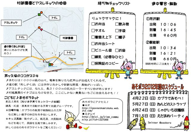 日祝日の親子の居場所 あそボラの日曜午後シリーズは目からウロコの企画満載で月1回開催中。 http://asovnetkamishaku.web.fc2.com/sundayafternoonseries.html ■初めての遠出 芦ヶ久保は奥武蔵と呼ばれる山の中にあります。 そんな山あいの町でいちご狩りとアスレッチク、自然散策まで楽しんじゃおうと思います! サポートのおとなスタッフもたくさん!! 山もいちごも初めてのお子さんにピッタリの遠足です ■いちご食べ放題 ぽかぽかな農園の本当にゆる〜い時間制限。 春の陽ざ