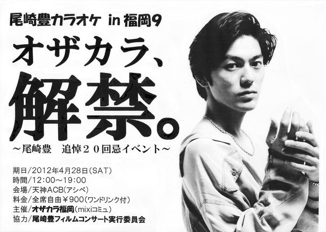 『尾崎豊カラオケ in福岡9』 期日:4月28日(土) 場所:天神ACB(アシベ) 時間:12:00〜19:00 料金:900円(ワンドリンク付) 福岡で唯一(らしいw)の「尾崎豊onlyカラオケ」イベントの第9弾♪ 今回は尾崎追悼20回忌イベント「第1回オザカラ対抗歌合戦」を開催!! ルール:チーム別に点数を集計、勝利チームにはなんと全員に尾崎グッズをプレゼント! 更に最高得点賞、ブービー賞などご用意しての大盤“尾崎”振る舞いイベントですよ〜!(笑) この日だけは、思いっきり尾崎でカラオケしちゃいましょう〜♪(*^O