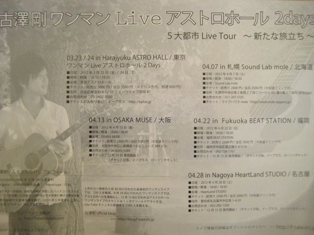 日程: 4月 22日(日) 開場 / 開演: 18:00 / 18:30 出演: 古澤剛 and more... チケット: 前売:2500円 / 当日:3000円(※別途ドリンク代) 会場: 福岡 BEAT STATION 住所: 福岡市中央区渡辺通り4-11-4 お問合せ: 092-738-1761 チケットのお取り扱い:ローソンチケットhttp://l-tike.com/ ※こちらはライブ終了後もネタバレ禁止となっております ライブ内容に関するお話は、下記のトピでどうぞ〜 http://mixi.jp/view_bbs.pl?id=68876741&comm_id=5549035