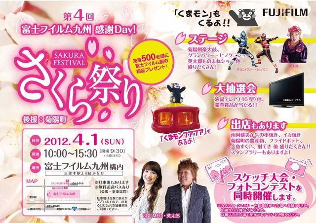 ☆第4回富士フイルム九州感謝Dayさくら祭り 2012年4月1日(日) 時 間:11:00頃(イベント10:00-15:30) 場 所:富士フイルム九州構内(JR豊肥線 三里木駅より徒歩5分) ※ 駐車場は別場所に設置。送迎バスがでます。 今年も富士フイルム九州熊本工場のさくら祭りに出動です!! 昨年は、震災の影響で中止となってしまったこのイベント。 今回は規模を大きくしてスケッチ大会&フォトコンテストも同時開催! カメラやクレヨン、色鉛筆は持参ください。 絵の具は水場がないため、水を汚さない為にもご遠慮下さい。 用紙は会場で配布され