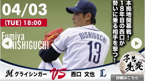西武ドーム START/18:00 予告先発 西口 文也 (西武) グライシンガー(日ハム)