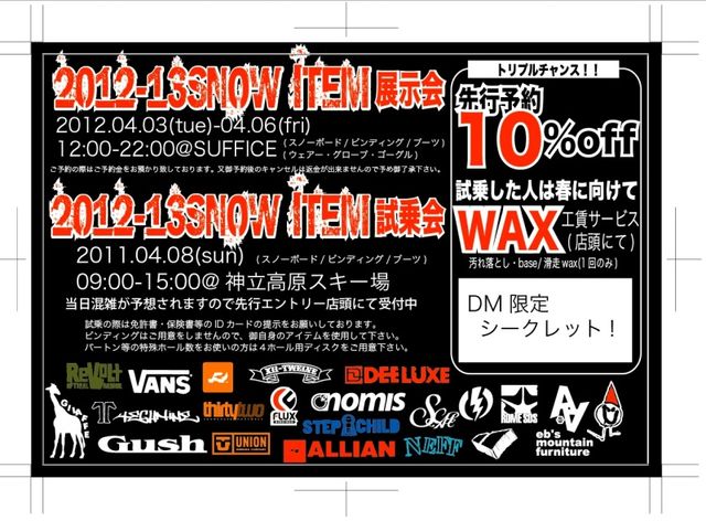 2012-2013展示会&試乗会 【展示会日時】2012.04.03(tue)-04.06(fri) 【場所】SUFFICE店内(12:00-22:00) 【参加費】無料 【展示ブランド】 ROME SDS / TWELVE / RIDE(BOARD&WEAR) / STEPCHILD / GILAFFE / LIB TECH / ALLIAN SCAPE / AA / GUSH / TECHNINE(BINDING&WEAR&BOARD) / NOMIS / FLAUNT / CAPPEL DEELUXE / 32(BOOTS&WEAR) / VANS / UNION / FLUX / REVOLT / IS DESIGN/ELECTRIC(予定) 【試乗会日時】2012.04.08(SUN) 【場所】神立高原スキー場(9:00-15:00) 【参加費】無料 【試乗ブランド】 ROME SDS / TWELVE / RIDE / STEPC