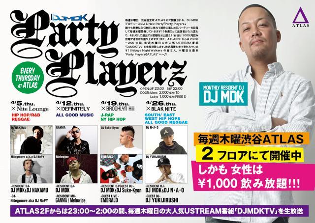 毎週木曜日の大人気パーティー 第一木曜はDJ TIME オンリーで開催 【PartyPlayerz@渋谷ATLAS】 女の子は終日"1000円飲み放題" 男性も1000円 メッセージを頂ければ毎週GUESTをお取りします (代表者のお名前とだいたいの人数を添えて..) やり取りが面倒な方はエントランスにて 【カベのゲストでカベ】 と言って下さい★ 誰でも何人でもMEN:\1000/NoLADY'S:\1000/飲み放題で入場可能です。お気軽にご利用下さい♪ ★☆★