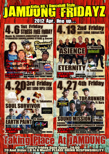 > 今週から開始されるジャムフラがJAMDUNG FRIDAYZとして完全リニューアル!! > メンバーも週代わりローテーションで神戸の夜を盛り上げます。是非ともチェックしてみてください!!4月のスケジュールは… > > 4/6 SOUND...GOODIES,UNDEFEATED SOUND,SYUNAUZAR SOUND,SOUND STRIKE & SECRET DJ > DANCE SHOW CASE : Dancehall Maddiez > 東京のMAD MOMO、MISHULAN、神戸のHARDCORE Jからなるトップダンサーコラボレーション!! 関西ではここだけ!!90年代ダンスホールたっぷりめで。GOODIESから最近のDANCEHALL REGGAE BESTのORIGINAL SELECT