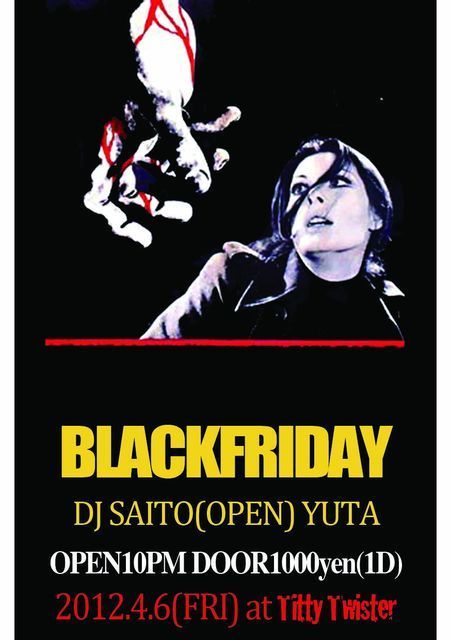 2012.4.6(FRI) "BLACKFRIDAY" at Titty Twister OPEN10PM ADD1000yen(1D) [GUEST DJ] SAITO(OPEN) [RESIDENT DJ] YUTA 今回はゲストで山形市からHOUSEPARTYでもDJしてもらった、さいとうくんが来てくれます!HIPHOPとHOUSEな夜にしたいです! よろしくお願いします!