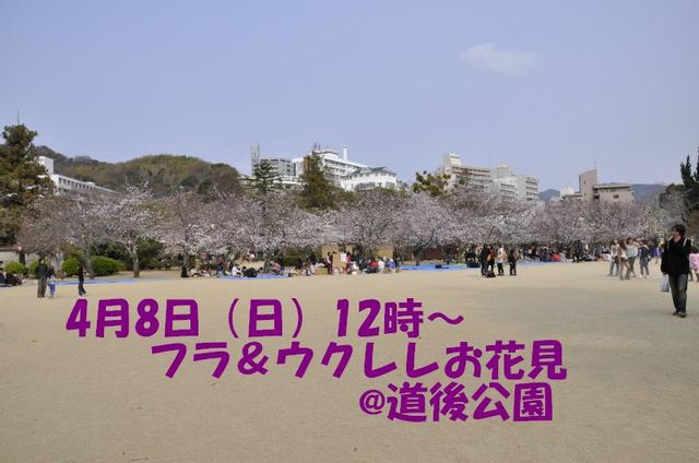 お花見のご案内です♪ フラ&ウクレレお花見パーティー @道後公園 日時:4月8日(日) 12時〜15時 場所:道後公園グラウンド (※雨天中止) 用意する物:お好きな飲み物、食べ物を各自持ち込み。 ウクレレお持ちの方はウクレレもw お手持ちのブルーシートやキャンプ用イス、座布団等ある方は持ってきていただけると嬉しいです。 参加費:場所代として500円程度ご用意ください。(道後公園ゴザ代) ウクレレ弾いて、歌って、フラ踊って、とっても華やかなお花見になると思いますw フラ好き、