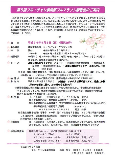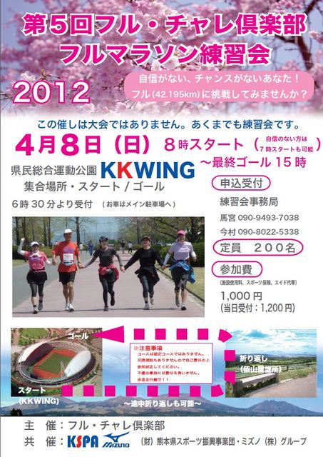 「第5回フル・チャレ倶楽部フルマラソン練習会」 今年で第5回目のフルチャレ コンセプトはこれからフルマラソンを目指す仲間のために! タイム測定がある訳ではなく、スピードを競うものではありませんが、熊本のいろんなクラブが集って大勢で42km楽しく練習しましょうという企画です。交通規制などないただの練習会ですが、簡単なエイドや距離表示などがあります。 コース:KKウイングスタート〜国体道路〜空港滑走路横の道〜西原セブン〜萌の里〜俵山→同じ道を折り返してKKウイングゴール 去年までとの変更点 ・KKウイングスタ