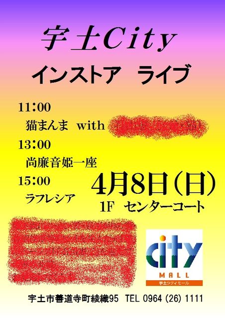 2012年の宇土シティライブが決定しました! 日時 4月8日(日) 宇土シティモール 1Fセンターコート(入場無料) http://www.utocity.co.jp/ こちらにも案内があります! 出演バンド 11:00 猫まんま with ミスター? 13:00 尚廉音姫一座 15:00 ラフレシア 今回の宇土シティライブには あのミスター?氏(日本が誇るベーシスト)が乱入?? ミスター?氏とは・・・ ヒント 尚廉音姫一座のファン 小山ルミ