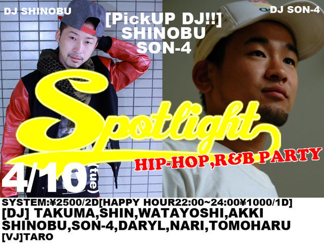 告知失礼します。 4/10 (火) 22:00-5:00 -HipHop, R&B Party- 『SPOTLIGHT』 @渋谷 Camelot 火曜camelotの大人気PARTY『Spotlight』 毎回400人規模で盛り上がっているこのParty!!!!! 第二火曜日のこの日はSpotlight@Camelotがどこよりも間違いないHipHop, R&B Partyをお届けします!!!! 是非遊びに来てみてください☆ ---------------------------------------------- ★ゲストお取りします★ 簡単ゲスト入場↓↓ 『ワタヨシのゲストでスポットライト』 と受付にて言って頂くと何名様でもゲスト料金で入