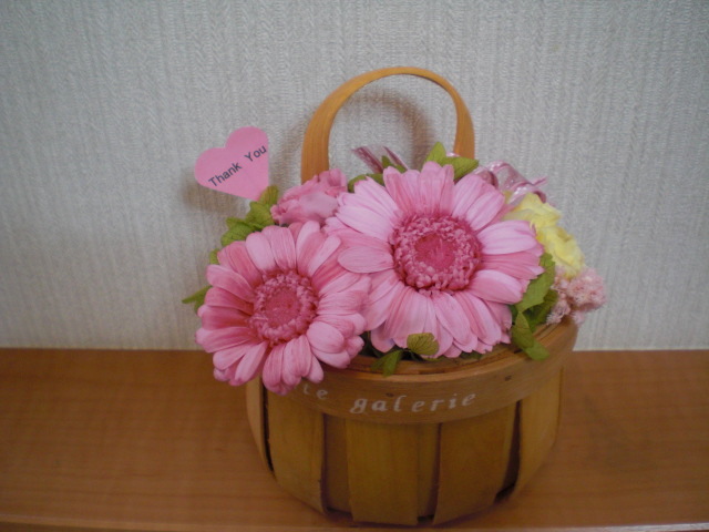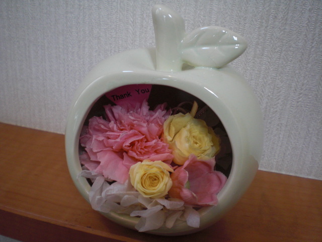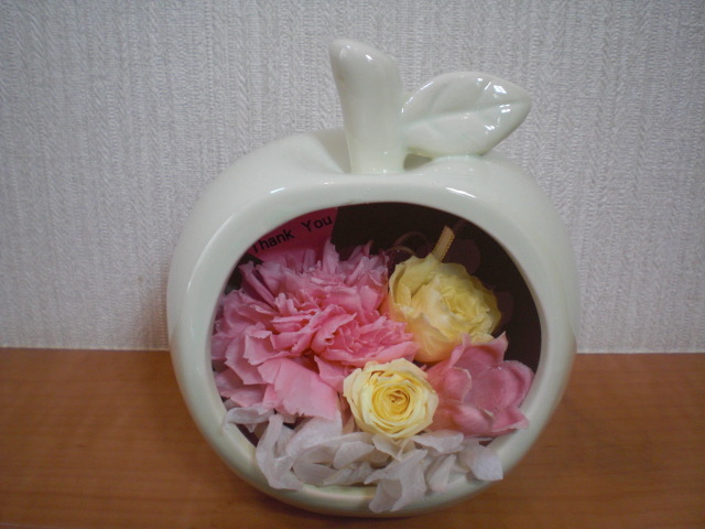 宮前区菅生で子連れOKのプリザーブドフラワー教室を主宰しています。 母の日に手作りアレンジを作ってプレゼントしませんか? もちろん、自分用に作ってもOKです。 A.リンゴポットのカーネーションアレンジ リンゴのポットのカーネーション、バラなど入れた可愛いアレンジです。 リンゴポットはグリーンとピンクがあります。(見本はグリーンです) B.ハンギングバスケットのガーベラアレンジ 置いても、壁にかけてもOKのハンギングバスケットにガーベラを 入れたアレンジです。ナチュラルな雰囲気が人気です。