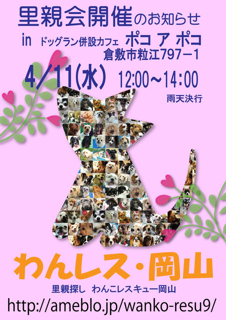 ※管理人の了承を得て告知させて頂いています。 【わんこレスキュー・岡山】は 保健所や愛護センターなどから行き場を失った犬達の 新たなスタートを始めるために里親探しをしています。 ポコアポコさんのご厚意により、里親会を開始させて頂きます。 里親希望ではなくても、お気軽にかわいいワンコ達に会いに来て下さいね メインブログ http://ameblo.jp/wanko-resu9/ 預かりママブログ http://ameblo.jp/happeachi/ 参加ワンコ(予定) キャバリア しずちゃん MIX ふーくん Mダックス ひなち