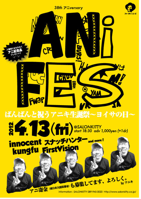 【犬も歩けばヨイサに当たる、ヨイサの道も一歩から、ヨイサのないところに煙はたたぬ、百聞は一ヨイサにしかず、しらぬがヨイサ。いえ!知っといたほうがイイヨ!! 4/13〜ヨイサの日〜はANIKIの誕生日!!みんなでANIKIの誕生日を祝おう☆】 2012.4.13(金)松山サロンキティ 38th アニversary『ANI FES』ばんばんと祝うアニキ生誕祭〜ヨイサの日〜 ●innocent http://www.fablerecords.jp/innocent/ ●スナッチハンター http://ip.tosp.co.jp/i.asp?i=69831689 ●First Vision http://24.xmbs.jp/first/ ●Kungfu http:/