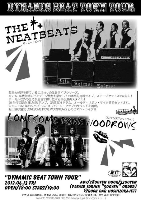 4月13日(金)18:00〜 「DYNAMIC BEAT TOWN TOUR」 *THE NEATBEATS *LONESOME DOVE WOODROWS ADV2800yen/DOOR3300yen (+1drink order) 全て60年代初期のビンテージ機材を駆使しての本格的再現ライブ、ステージセットはPA無し!! ボーカル以外の全てが生音で繰り広げられる演奏スタイル!! 60年代初期のSELMERアンプ、GRETSCHドラム、オールド・リボン・マイク等でセットされ、まさに1963年のリバプール、キャバーン・クラブのサウンドを再現。 ※チケット発売開始! (限定80枚) お問い合わせは星空JETTまで。