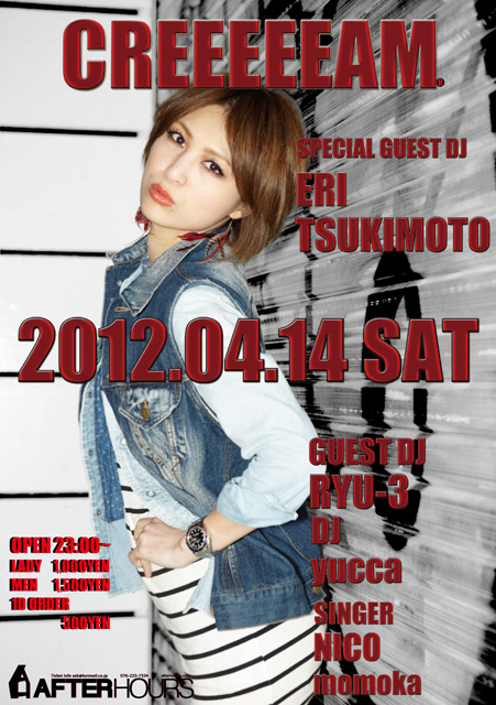 OPEN 23:00 SPECIAL GUEST DJ ERI TSUKIMOTO GUEST DJ RYU-3 DJ yucca / SINGER / NICO / momoka TICKET LADY 1000yen MEN 1500yen 1D ORDER 500yen