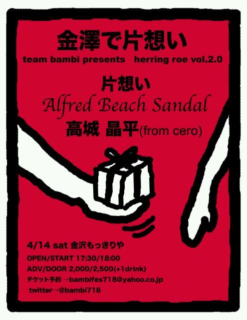 告知、失礼いたします。。 ***Alfred Beach Sandal 金沢初ライブがあります*** team bambi presents~金澤で片想い~ □2012年4月14日(土) at 金沢:もっきりや □出演:片想い,alfred beach sandal,高城晶平(cero) □open17:30 □start18:00 □前売2,000円 □ご予約→bambifes718@yahoo.co.jp ご縁がありましたら、どうぞ遊びに来てください。 よろしくお願いいたします。
