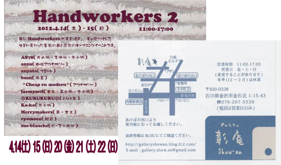再びHandworkersが集まります。 ギャラリーとして生まれ変わった金石の蔵と民家のオープニングイベントです。 2012/4.14(土).15(日).20(金).21(土).22(日) 11時〜17時 展示日が延長になりました。 ぎゃらりぃ彰庵 金沢市金石北1-15-43 http://galleryshowan.blog.fc2.com/ 前回の様子 http://blogs.yahoo.co.jp/mi7phone/65759043.html http://blogs.yahoo.co.jp/mi7phone/65776141.html
