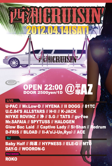 管理人様、告知失礼します。 4月14日 土曜日 平塚@AZ 西湘CRUISIN' vol.1 横浜の@THE BRIDGE YOKOHAMAで毎月第4木曜日に開催されてる平日とは思えないほど集客と盛り上がりをみせてるCRUISIN' CRUISIN'出演者から全国の若手までを集めたコンピレーションアルバムを2009年、2011年に全国RELEASEも果たした。 2012年7年目を迎えたCRUISIN'、横浜だけに留まらず神奈川県を盛り上げるにあたって平塚@AZにて西湘CRUISIN'を発足。 2012年リニューアルした平塚@AZの雰囲気、音も最高です! 記念すべきvol.1はGUESTにU-PAC, Mr.Low-D, HYENA
