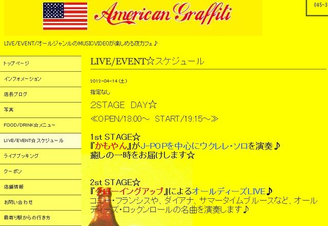 横ウクの皆さん 横ウク管理人の”かもやん”のライブです。 ----- 日時:4月14日(土) 19:15〜19:55(予定) 場所:ライブハウス「American Graffiti」 最寄駅は、横浜市営地下鉄/京浜急行 上大岡駅 徒歩3分 ----- 【告示】 http://r.goope.jp/amegura/calendar/246290 【アクセス】 http://r.goope.jp/amegura/free/access よろしくお願いします。