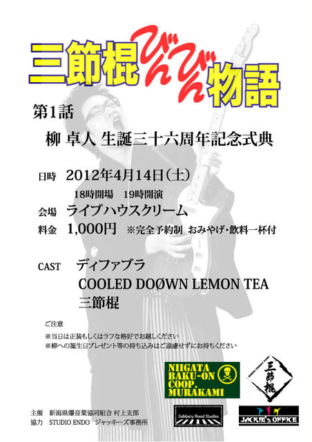【第1話 柳 卓人 生誕三十六周年記念式典】 日時 2012年4月14日(土) 開場18時 開演19時予定 場所 ライブハウスクリーム 料金 1,000円 ※おみやげ・飲料1杯付 キャスト ディファブラ COOLED DOφWN LEMON TEA 三節棍 昨年10月の【毎度おさわがせします パート2】でまさかの戦線離脱だった柳が、 フル充電して4月に帰ってきます。 自ら36歳年男を祝うべく、記念式典を挙行致します。 そんな今回の三節棍が繰り出す楽曲は、柳のルーツに関係するものばかり。 大半の方が興味ないこ