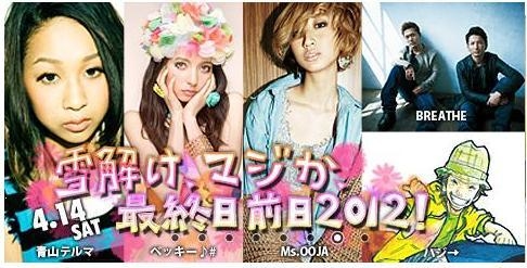 今年からはじまった神立高原スキー場の『OTODAMA』ライブにいきましょう。 ライブ閉幕1日前のイベントで出演者が凄いです。 ベッキー、青山テルマなどの参加で前売り3000円は安いでしょう。 ライブは会場15:45〜なので14:00頃までスキーで、お風呂入浴後にライブ会場へGo!Go! もちろんスキーだけの参加でもOKです。 スキー会場は神立を予定していますが、状況により別スキー場に変更の可能性あり。 ライブチケットは、売り切れ次第(多分大丈夫と思うけど)ですので参加したい時に売り切れの場合は、ゴメンなさい。 ⇒【重要】