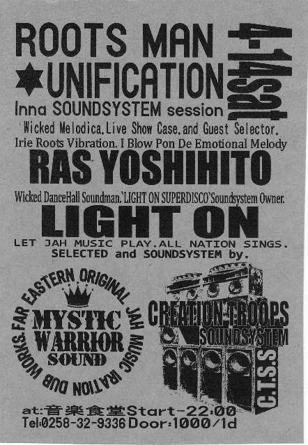 管理人様 告知失礼します。 3・31の東京吉祥寺WARPで行われた2SOUNDSYSTEM「DUB SUMMIT」の興奮冷め止まぬまま、来る4/14に音楽食堂でSOUNDSYSTEM DANCEを開催します。 心身スピーカー共に成長を遂げたRoots SOUNDSYSTEM[CREATION TROOPS SOUNDSYSTEM] HOME DUB STUDIOを一転したORIGINAL JAH MUSIC IRATION DUBWORKS[MYSTIC WARRIOR SOUND]を軸に毎回SOUND CREWをGUESTに呼び、ROOTS DUB DANCEを長岡で繰り広げていきます。 今回のGUESTは中越地区が誇るreggae band[IRIE ROOTS VIBRATION]のFRONT LINE[RAS YOSHIHITO]のピアニカライ