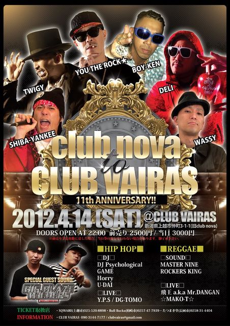 2012.4.14 (SAT) club nova→CLUB VAIRAS 11th anniversary!! ■@CLUB VAIRAS(上越市仲町3-1-1) ■OPEN 22:00〜 ■TICKET 前売 ¥2,500 当日 ¥3,000 ※前売り券が予定枚数に達した場合及び混雑時は当日券の発行が出来ない場合があります。 前売り券のお早めの購入、当日のお早目の入場をお勧めします。 -SPECIAL GUEST LIVE- BOY-KEN SHIBA-YANKEE YOU THE ROCK★ TWIGY DELI WASSY -SPECIAL GUEST SOUND- BIG BLAZE WILDERS □HIP HOP□ -DJ- DJ Psychological GAME Horry U-DAI -LIVE- Y.P.S DG-TOMO