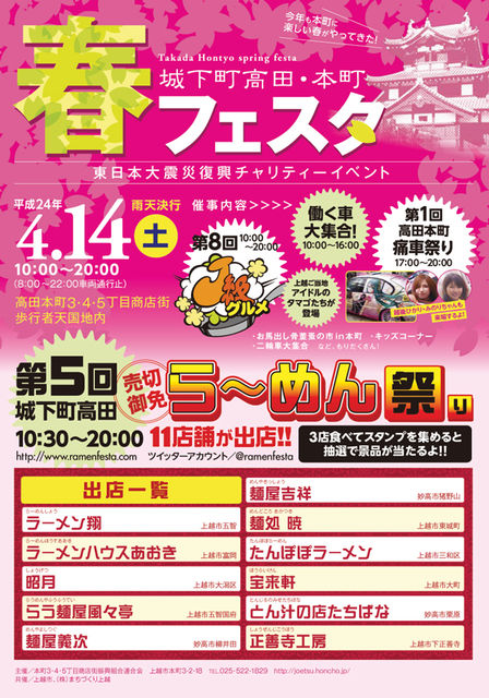展示参加者募集です。 最大16台で今のとこと11台確定しております。 詳しくは 城下町高田・本町 春フェスタ http://www.ramenfesta.com/ 申し込み詳細はK-WINDSです。 http://juc-officek.cside.com/ 当日は16時、TSUTAYA高田西店に集合し、イベント終了→解散となります。