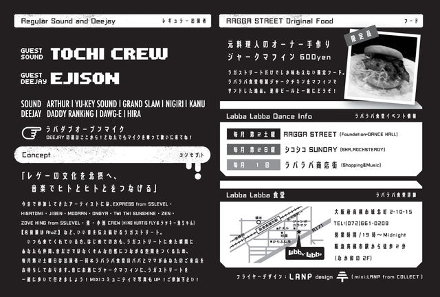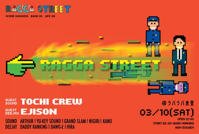 管理人様、失礼します。 ☆★RAGGA STREET★☆ 通称ラガスト!! 古き良きREGGAE MUSICからブランニューまでがっつりかかります!!! 気になる方はどんどん参加してくださいね!!! ★☆RAGGA STREET☆★ 暖かくなりだした4月のラガスト!! 今回は大阪はミナミを中心に活躍中のM-KEYをGUest deejayに、 そしてGuest soundには京都よりReggae Toy BoxことDJ 山ちゃんを招き大開催しちゃいます!! 危険な香りプンプンの4月RAGGA STREET!!Don`t Miss it!! それにRAGGA STREET限定のジャークチキン