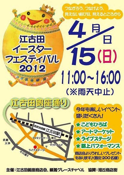 第7回“江古田イースターフェスティバル2012” ♪アートマーケット出店・路上パフォーマンス・野外ステージバンド♪ ***参加募集中*** ☆開催日:2012年4月15日(日) 雨天中止 ☆開催時間:11時〜16時(集合10時) ☆会場:江古田銀座通り ☆定員:アートマーケット25組/路上パフォーマー4組/野外ステージバンド(音楽)数組 ☆参加費用:無料 ☆注意事項 ※アートマーケットは、アマチュアでオリジナル作品の販売です (ご家庭で不要になったものを販売するフリーマーケットとは異なります)