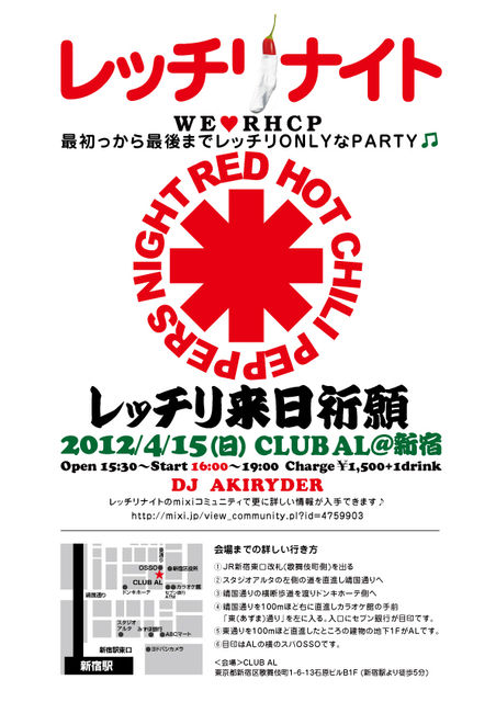 昨年のまさかのサマソニ来日、新譜リリース、映画上映と、 怒涛の如くレッチリづくしだったレッチリ熱を 再燃させるかの如く「来日祈願」と題した激アツパーティー「レッチリナイト」が 4/15(日)にロックの聖地 新宿にて開催決定しました! 今回も大人のレッチリファンに優しい16時スタートです 濃ゆい内容でガッチリとレッチリのグル―ヴを 心ゆくまで楽しんでいただきます* ///////////////////////////////////////////////////////// レッチリナイトとは、「RED HOT CHILI PEPPERS」の主に原曲を 大音量で聴きながらお酒を