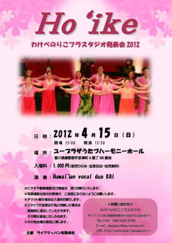 ¢¡¤ï¤±¤Ù¤Î¤ê¤³¥Õ¥é¥¹¥¿¥¸¥ªÈ¯É½²ñ2012 ²ñ¡¡¾ì ¡¡¥æ¡¼¥×¥é¥¶±§Â¿Äťϡ¼¥â¥Ë¡¼¥Û¡¼¥ë ±é¡¡ÁÕ ¡¡Hawaiian vocal duo KAI »þ¡¡´Ö ¡¡³«¾ì¡¡£±£³»þ ¡¡¡¡¡¡¡¡¡¡ ³«±é¡¡£±£³»þ£³£°Ê¬ Æþ¾ìÎÁ¡¡Á°Çä¤ê³Æ£±,£°£°£°±ß¡¡¡ÊÁ´Àʼ«Í³¡Ë ¡¡¡¡¢¨¥Ó¥Ç¥ª&ư²è»£±Æ¤ª¤è¤ÓÏ¿²»¤Ï¶Ø»ß¡£ ¡¡¡¡¢¨¥Á¥±¥Ã¥È̵¤¾ì¹ç¤ÏÆþ¾ì¤ò¤ªÃǤꤤ¤¿¤·¤Þ¤¹¡£ ¡¡¡¡¢¨¥¹¥¿¥Ã¥Õ¤¬ÌÂÏǤʹ԰٤ÈȽÃǤ·¤¿¾ì¹ç¤Ï¶¯À©Åª¤Ë ¡¡¡¡¡¡Âà½Ð¤ò´ê¤¦»ö¤¬¤¢¤ê¤Þ¤¹¡£ ¡¡¡¡¡¡¤½¤Î¾ì¹ç¤ÎÎÁ¶â¤Ï¡¢ÊÖ¶âÃפ·¤«¤Í¤Þ¤¹¤Î¤Çͽ¤á ¡¡¡¡¡¡¤´Î»¾µ¤¯¤À¤µ¤¤¡£ ¡¡¡¡¢¨Á´Àʼ«Í³¤Ç¤¹¡£ ¡¡¥Á¥±¥Ã¥È¤Î¤ªÌ䤤¹ç¤ï¤»