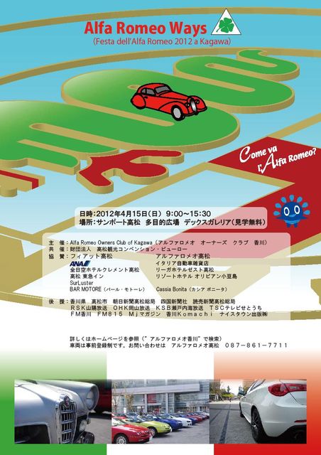 Alfa Romeo Ways¡ÊÂ裴²ó Festa dell'Alfa Romeo 2012 a Kagawa¡Ë ¡¡¡¡¡¡¡¡¡¡Come va l'Alfa Romeo? ¡Ê¥³¥á¥ô¥¡¡¡¥é¥ë¥Õ¥¡¡¡¥í¥á¥ª¡Ë ¡¡¡¡¡¡¡¡¡¡¡¡¡¡¡¡¡Ê¥¢¥ë¥Õ¥¡ ¥í¥á¥ª¤ÎÄ´»Ò¤Ï¤É¤¦¤Ç¤¹¤«¡©¡Ë ¤´Ìµº»ÂÁ¤·¤Æ¤ª¤ê¤Þ¤¹¡£ ¿À¸Í¤Ç75Evo¤Ë¾è¤ë¡¢¤Þ¤Ã¤Á¤ã¤ó¤È¿½¤·¤Þ¤¹¡£ ¤µ¤Æ¡¢¥ï¥¿¥¯¥·¤¬¹â¾¾ºß½»¤Îº¢¤ËÂè1²ó¤¬³«ºÅ¤µ¤ì¤¿¤³¤Î¥¤¥Ù¥ó¥È¤â¡¢¤ª¤«¤²ÍͤǺ£Ç¯¤Ç4²óÌܤò·Þ¤¨¤ë»ö¤¬¤Ç¤¤½¤¦¤Ç¤¹¡£ º£²ó¤Ï¡¢³§¤µ¤Þ¤Ë¤è¤ê¿Æ¤·¤ß¤ò´¶¤¸¤Æ¤â¤é¤¨¤ëÍÍ¡¢¥¤¥Ù¥ó¥È̾¾Î¤òÊѹ¹Ãפ·¤Þ¤·¤¿¡£ Festa dell'Alfa Romeo 2012 a Kagawa¤â°¤¯¤Ï¤Ê¤¤¤È»×¤¤¤Þ¤¹