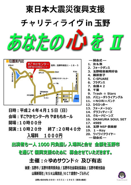 ¡ù¤æ¤á¥µ¥¦¥ó¥É¡ù¼çºÅ ÅìÆüËÜÂç¿ÌºÒ¥Á¥ã¥ê¥Æ¥£¥é¥¤¥Öin¶ÌÌî¡Ö¤¢¤Ê¤¿¤Î¿´¤ò?¡×³«ºÅ·èÄꡪ Æü»þ¡§Ê¿À®£²£´Ç¯£´·î£±£µÆü¡ÊÆü¡Ë ¡¡¡¡¡¡³«¾ì£±£°»þ£°£°Ê¬¡¡³«±é£±£°»þ£²£°Ê¬¡¡½ªÎ»£²£°»þ£´£°Ê¬ ¾ì½ê¡§¤¹¤³¤ä¤«¥»¥ó¥¿¡¼¡¦¤ä¤Þ¤â¤â¥Û¡¼¥ë ¡¡¡¡¡¡¶ÌÌî»Ô±ü¶Ì£±¡Ý£±£¸¡Ý£µ ¡¡¡¡¡¡http://map.goo.ne.jp/map.php?MAP=E133.55.30.930N34.29.0.780 Æþ¾ìÎÁ¡§£±£°£°£°±ß¡ÊÁ°Ç䡦ÅöÆü¡¡¶¦¡Ë ¼çºÅ¡§¡ù¤æ¤á¥µ¥¦¥ó¥É¡ù¡¡µÚ¤Ó¡¡Í»Ö ¸å±ç¡§¶ÌÌî»Ô¡¦¶ÌÌî»Ô¶µ°é°Ñ°÷²ñ¡¦¶ÌÌî»Ô¼Ò²ñÊ¡»ã¶¨µÄ²ñ¡¦¶ÌÌî»Ô´Ñ¸÷¶¨²ñ ¡¡¡¡¡¡»³ÍÛ¿·Ê¹¼Ò¡¦£Ò£Ó£Ë»³ÍÛÊüÁ÷¡¦