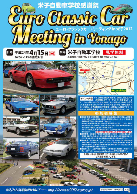 米子自動車学校感謝祭 ユーロ・クラシックカー・ミーティング in 米子2012 米子市で欧州旧車の置きのイベントを開催して4年目です!春の休日を車を囲んで過ごしませんか? 車輌展示参加申込方法 開催日時 : 平成24年4月15日(日)10:00〜15:00 (雨天決行) 申込締切 : 平成24年3月31日(土)まで 参加費用 : 1台につき@1,000円 (当日、車イベント受付でお支払い下さい。 今年から申し訳ありませんが、諸経費として集めさせて頂きます。) 注意事項 : 自