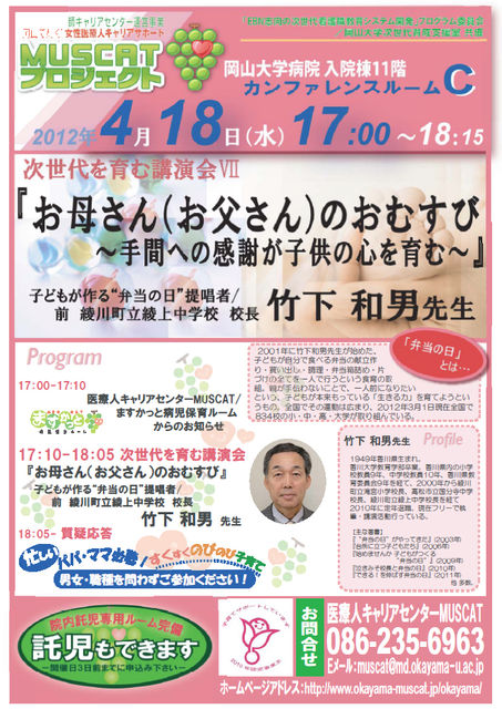 岡山大学病院にて竹下和男先生の講演会を行います!入場無料なので近隣にお住まいの皆様、是非ともご参加ください!! ■岡山県女性医師キャリアセンター運営事業 MUSCATプロジェクト/主催 次世代を育む講演会? 『お母さん(お父さん)のおむすび〜手間への感謝が子どもの心を育てる〜』 【演者】竹下 和男先生 【日時】2012年4月18日(水)17:00〜18:15 【場所】岡山大学病院 入院棟カンファレンスルームC (岡山市北区鹿田町2-5-1 岡山大学鹿田キャンパス内) 【参加費】無料 【対象】医療者、教育関係