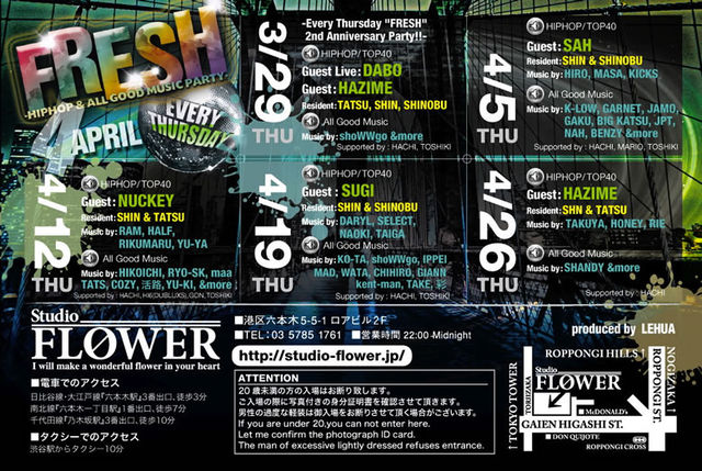 4月19日(木)は六本木 Studio FLOWERにて、 毎週木曜日の鉄板HipHop Party『FRESH』が開催されます!! 『★DJタイガのゲストでフレッシュ★ 』 と1Fエントランスにて★〜★をそのままお伝え頂ければ、何名様でもゲストで入場できますので、御利用下さい。 個別のディスカウントゲストもお取りできます。 希望の方はお気軽にメッセージお待ちしております。 参加希望の方は 代表者の方のカタカナフルネームと人数を私にメッセージで送ってください 例 「4/19日FLOWERディスカウント希望」 ヤマダ タロウ 5人