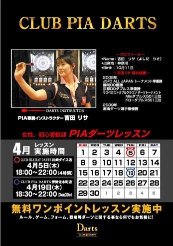 毎月恒例の当店専属インストラクター吉田リサさんによるダーツレッスンの日程が決まりましたのでお知らせします。 今月は4月19日(木)18時30分〜です。 参加費などは必要ないのでお気軽にどうぞヾ(*'▽'*)ノ
