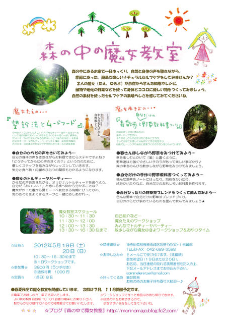 管理人さん。 ご紹介のスペースを毎回かしてもらいありがとうございます。 またまたご紹介スペースを貸して下さい。 ★★★★★★★★★★★★★★★★★★★★★★★★★★★★★★★★★★★★ 第2回目!! 『森の中で魔女教室』 開催内容決定しましたー。 今回の魔女ゆきよは、キラキラした森の中を野草摘みながらお散歩したり、 宮崎の太陽のエネルギーがたっぷ〜〜〜り入った野草などで 自分にぴったりな野草をブレンドして、マイブレンド野草茶を作ってみたり、 自分だけの野草の教科書を作ったり・・・。
