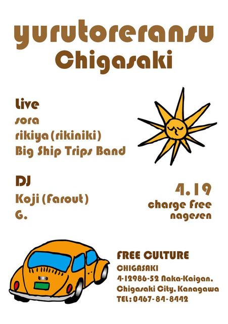 フリーカルチャー茅ヶ崎店 open 16時30分 投げ銭 Live SORA 大船の夫婦ユニット 優しいギターとステキな歌声できもちい空間を生み出してくれます。 rikiya(rikiniki) rikinikiのギタリストりきやくん。 今回はソロで参加です。 http://www.rikiniki.com/ BigShipTripsBand http://bigship.koukin.net/ DJ koji(farout) http://www.faroutstore.jp/ G.
