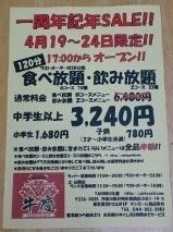 SAGINUMA牛慶です お陰様で一周年!! 日頃の感謝を込めまして、明日19日木曜日から来週24日火曜日まで一周年記念SALEをやっちゃいます!! 食べ放題Bコース70種と 飲み放題2コース33種の 通常6,480円コースが ↓↓↓ なんと3,240円!! (中学生以上) しかも時間は 120分!! 小学生 1,680円 子供 780円 (3才〜小学生未満) ※食べ放題・飲み放題に含まれていないメニューは全品半額でご注文頂けます!! ※飲み放題はグラス交換制となりまして食べ残し飲み残しは通常料金を頂きます ※食べ放題・飲み放題