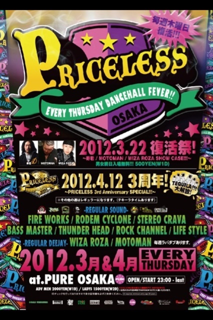 告知失礼します ☆☆☆☆☆☆☆☆☆☆☆☆☆☆☆☆☆☆☆☆☆☆☆☆☆☆ 4年目に突入した大阪ミナミ・灼熱のDANCEHALL!!!!! 関西を代表するSOUNDやARTIST・DANCER達が 毎週木曜日、熱いDANCEHALLを繰り広げています!!!!! am1:00〜2:00と3:00〜4:00はテキーラ飲み放題!!!!! ☆☆☆☆☆☆☆☆☆☆☆☆☆☆☆☆☆☆☆☆☆☆☆☆☆☆ ■□■□■□■□■□■□■□■□■□■□■□■□■□■□■□■□■□■□■□■□■□■□■□■ "EVERY THURSDAY DANCEHALL REGGAE FEVER!!" 『PRICELESS』 <REGULAR SOUND> STEREO