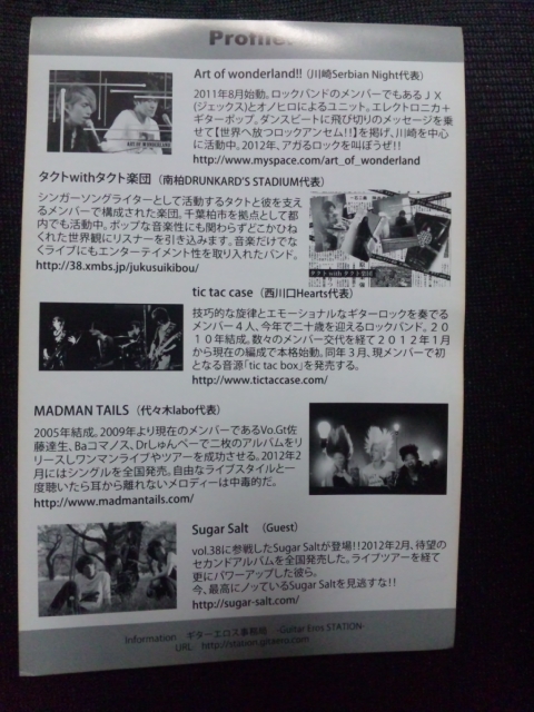 OPEN 18:00 START 18:30 前売券/¥1,800 当日券/¥2,100 (4会場通し券/¥3,000) 川崎Serbian night代表:Art of wonderland! http://www.myspace.com/art_of_wonderland 南柏ドランカーズスタジアム代表:タクトwithタクト楽団 http://38.xmbs.jp/jukusuikibou/ 西川口Hearts代表:tic tac case http://tictaccase.jimdo.com/ 代々木labo代表:MADMANTAILS http://www.madmantails.com/ OB:Sugar Salt(Vol.38 新横浜BELL'S代表) http://sugar-salt.com/ (O.A)TR.ASH