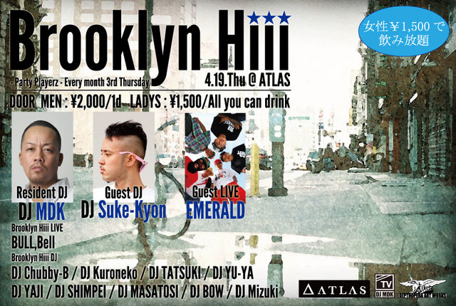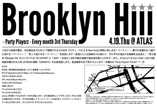 ■2012/4/19/thu ■「Party Playerz」3rd thursday "Brooklyn Hiii" ■「ATLAS」 http://www.shibuya-atlas.com/ ■料金 DOOR MEN:2000/1d LADYS:1000/飲み放題 ■OPEN 2F 23:00〜 B1 22:00〜 ■イベント紹介文 3月から毎週木曜日、渋谷道玄ATLASにて開催されるDJ MDKプロデュースによるNew Party!! 純粋に楽しめる"パーティー"。誰でも気兼ねなく遊びに来れる"パーティー"。"笑って過ごせるパーティー"を目指します! 各週ごとに出演者が入れ変わり、それぞれの演出でお客様をお出迎え!!第3週は"Brooklyn Hiii"!!