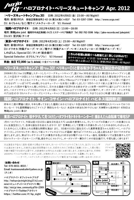 主宰のクニオさんに代わってイベント告知します。 3週連続ハロプロ関連イベント東京開催の最後は、多彩なDJ陣によるハロプロ曲乱れ撃ち!! 自分もDJします。持ちうる限りの振り幅で楽しい時間をつくりたいと思っています。 ぜひお越しください! ---- “ハロナイ新人公演第2幕 〜初々しくってごめんね〜” 日時:2012年04月21日(土) 23:00〜All Night!! 会場:新宿URGA 03-5287-3390 住所:新宿区歌舞伎町2-42-16第二大滝ビルB1 http://www.urga.net/ 料金:当日2000円(1ドリンク付) DJ:おくちゃん/なこ/