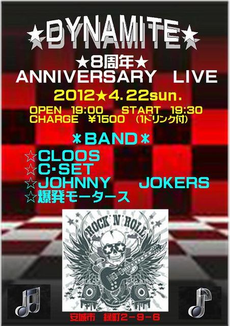 OPEN 19:00 START 19:30 CHARGE ¥1500 (1ドリンク付) ★CLOOS ★C・SET ★JOHNNY JOKERS ★爆発モータース