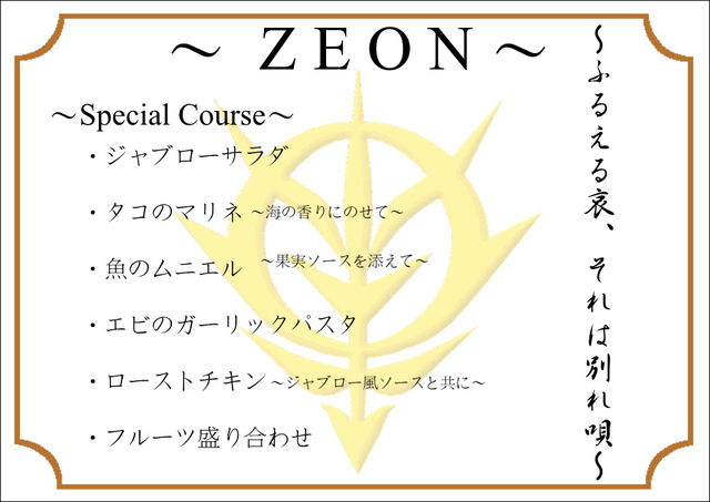 鷲は舞い降りる・・ ↑(言いたいだけw) 皆さん、ジオンライフ如何お過ごしでしょうか? そんな私【キョン】は毎日ジークジオンっていうくらい満喫してますよ(笑) さて!今回のイベントはいつもと雰囲気が違います コース料理のイベントです(*^_^*) 「えっ?いつもと変わらないんでしょ?」 とんでもございません いつものコース料理を一切使わず、 【キョン】が完全プロデュース 今まで持ってきた飲食経験の粋の粋を集め、 自分でも満足のいくコース料理を作らせていただきます。 常連様の皆様はご存