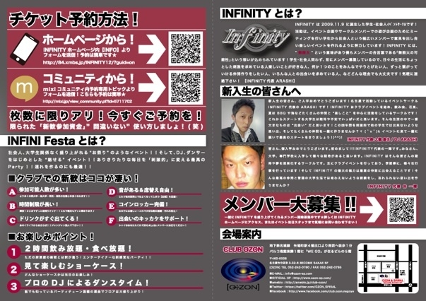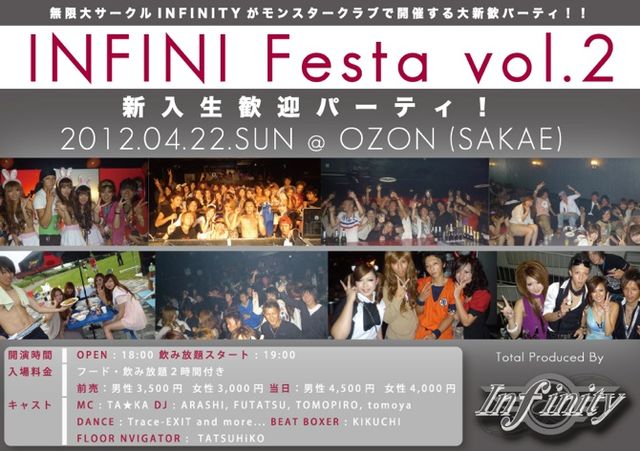 INFINI Festa vol.2 〜新入生歓迎 Party〜 新入生の皆さんご入学おめでとうございます 今回INFINITYは、新入生のご入学のお祝いや社会人の方のストレス解消も兼ねて…(笑) 堂々の、クラブイベントの開催が決定 今回のお得な… お楽しみポイント ■2時間飲み放題、フード付き ■見て楽しめるショーケース どんなショーケースかは、当日のお楽しみ ■プロDJによる誰でも知っている選曲の音楽、ダンスタイム ただの居酒屋の新歓と