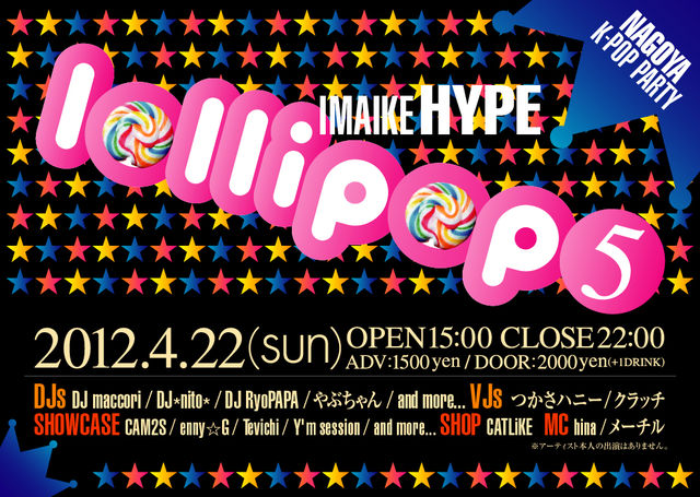 【チケット予約方法】 ★Lollipop vol.5★開催日決定!! 2012.04.22(sun)@今池HYPE OPEN 15:00 CLOSE 22:00 【Ticket】 前売り\1500 当日\2000 ※共に別途1D \500 ☆★☆★☆★☆★☆★☆★☆★☆★ ※トピックに必ず希望枚数の書き込みをお願いします。 チケット受け取り・代金お支払方法 ◆イベント当日、会場受付にて引き換えとさせて頂きます。 その際、《mixi名》をお申し出ください。 (mixi名を変更された方はご予約時のお名前を受付にお申し出下さい。) 注意事項 ※トピックに書き込む際