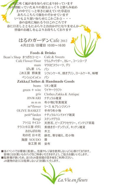 旭市にあるラ.ヴィ.アン.フルールさんの お庭で開催されるイベントに参加します。 はるのガーデンCafe 4月22日(sun) 10:00〜16:00 http://fragrantkh.exblog.jp/17933846/ 庭に吹く風が春を知らせに走り回っています。 冬の間眠っていた木々の蕾はぷっくりと膨らみ始め、 土の中でじっと寒さに耐えていた草花は、 あちらこちらで顔をのぞかせています。 いつもより遅い知らせに恐々と・・。 春の息吹に触れる今日この頃です。 春の日差しとともにぶらりとお出かけになりませんか。 みなさまのお越しをお待ちしております。 F